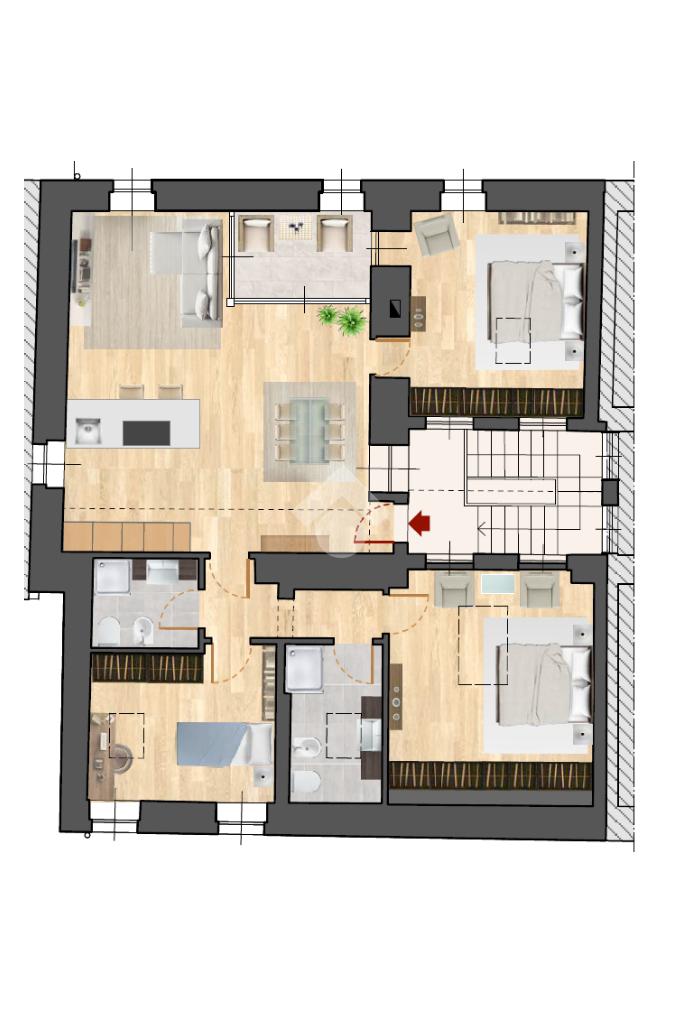 MOMPIANO in zona tranquilla, proponiamo in vendita ampio appartamento posto al secondo ed ultimo piano in corso di ristrutturazione totale a nuovo. Il contesto abitativo dalla caratura storica verrà ristrutturato anche esternamente e non sarà dotato di ascensore. Internamente l'immobile è composto da un'ampia zona giorno con cucina a vista valorizzata dall'accesso all'esclusiva terrazza a tasca; tre le camere da letto caratterizzate da una buona metratura interna e doppi servizi di cui uno dotato di velux. L'immobile è in corso di ristrutturazione totale e sarà dotato di riscaldamento a pavimento con teleriscaldamento autonomo, predisposizione per l'aria condizionata ed i serramenti esterni in alluminio a taglio termico. Esternamente nella parete esposta a Nord sarà presente un cappotto esterno mentre nelle altre pareti sarà presente nella controparete. I lavori sono appena iniziati e la consegna è prevista per Marzo 2026. Attualmente è possibile personalizzare gli ambienti scegliendo le finiture interne tra cui i pavimenti. Di pertinenza esclusiva due posti auto all'interno dell'esclusiva corte.